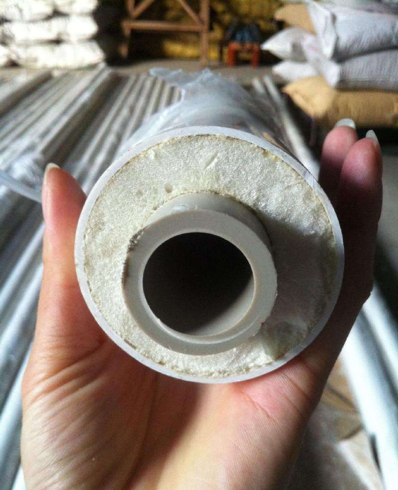 PVC热水保温管就是我们现在很常见的硬质塑料管.它是使用聚氯乙烯(PVC)塑料经过一次熔融挤出成型.主要用于给,排水用.但是由于内壁光滑,倒水时很容易产生很响的流水声.芯层隔音发泡 PVC排水管是先用聚氯乙烯(PVC)塑料添加发泡剂经过熔融挤出成型,发泡剂急剧分解在PVC塑料内产生无数的细小孔